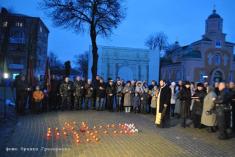 Серед запалених вогників трауру гордо звучало:"Слава Україні! - Героям слава!" На фоні темного вечірнього неба майоріли прапори Окремого Прилуцького козацького полку ім.Петра Сагайдачного та козацького куреня ім.Івана Сірка, члени Прилуцького осередку "Просвіта" ім.Тараса Шевченка розкладали і запалювали слово "Геноцид".