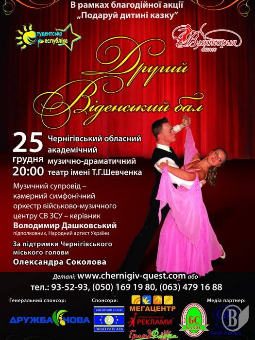 25 грудня в приміщенні Обласного музично-драматичного театру ім. Т.Г.Шевченка пройде Другий Віденський бал у місті Чернігові в рамках благодійної акції «Подаруй дитині казку». Початок о 20-00.