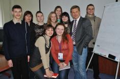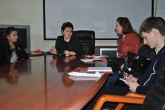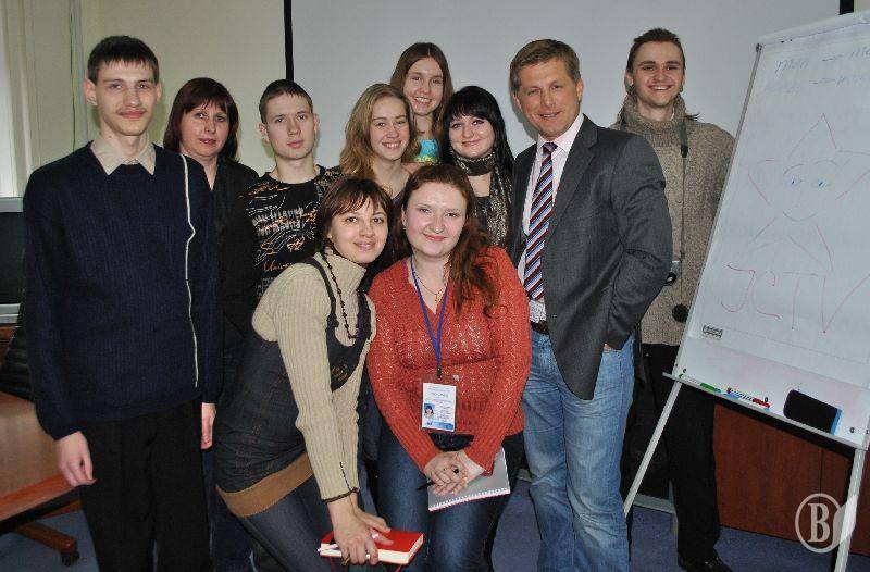 Згодом підійшла Олена Фроляк, головний редактор інформаційного відділу каналу ICTV та ведуча програми «Факти». Надзвичайно розумна і вродлива жінка, як на екрані, так і в житті. Олена розповіла нам основні правила відбору інформації. По-перше: потрібно брати ту інформацію, що буде цікава телеглядачам, а не якомусь окремому журналістові. По-друге: не повинна допускатися у загальних інформаційних блоках так звана «чорнуха» - це все окремою передачею пізно увечері, чи окремою сторінкою в друку. З кримінальних новин повинні бути лише ті, що зачіпають цінності високоморальної людини, а не ті, де наприклад, кривава міжусобиця в сім`ї алкоголіків. Також Олена поділилася з нами досвідом переходу із локальних Івано-Франківських ЗМІ на столичний телеканал ICTV. Виявляється, це було справою випадку: коли Олена проходила стажування у Великій Британії (до речі, з Івано-Франківська туди потрапила, а не зі столиці), до неї зателефонував її колишній однокурсник і запропонував взяти участь у новому проекті «Вікна». «Ось, саме так усе й було. І бачите, вже 10 років працюю на ICTV», - каже Олена. Бажаючим пробитися, радить починати з себе: правильна професійна освіта, мобільність, грамотність і самоосвіта - ось всі секрети успіху. Найцікавіше те, що попри важкий графік роботи Олена ще й по повній хазяйнує у своєму будинку: готує, прибирає та займається дітьми. З нетерпінням чекає вихідних, щоб повністю віддатися сімейним турботам.