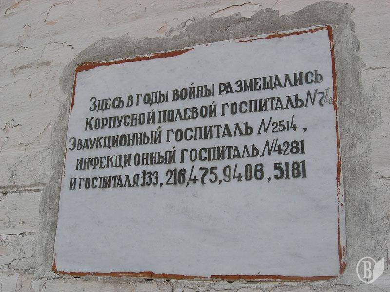 На будівлі встановлена меморіальна табличка з текстом: «Тут в роки війни були розміщені корпусний польовий госпіталь № 74, евакогоспіталь № 2514, інфекційний госпіталь № 4281 та шпиталі 133, 216, 475, 2406, 5181».