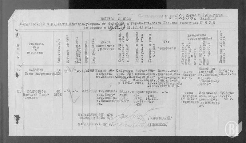 Із госпітальних документів дізнаємося, що на сільському кладовищі захоронені воїни 26 дивізій і їх п’ятдесяти двох полків, а також 2-го прикордонного загону НКВС, 182 загороджувального загону, 49 окремого понтонного батальону, 75 робітничого батальону, автотранспортного батальону, евакороти, 165 штрафної роти та ін. Серед останніх тут була похована єдина жінка – Орел Євдокія Юхиміна.
