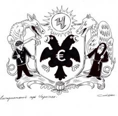 Погладшавший за рахунок планово залучених під ЄВРО-2012 інвестицій у сферу туризму, центральний двоголовий персонаж герба уособлює зв'язок візантійського геральдичного минулого і наслідками недавньої техногенної катастрофи.