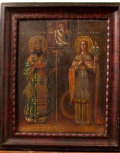 Серед них – ікона «Святитель Феодосій Углицький та Св. Катерина», ХІХ ст. Вона привертає увагу, насамперед, досить рідкісним іконографічним сюжетом. На іконі зображені Святитель Феодосій Углицький та Св. Катерина на повен зріст. Поряд з вликомученицею Катериною – колесо – знаряддя її тортур. У верхній частині ікони – Св. Микола, який молиться перед престолом з чашею для причастя.