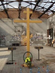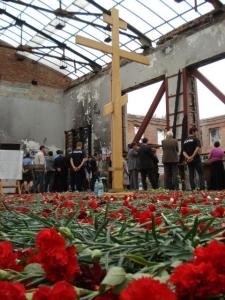 Залишивши наплічник на подвір’ї монастиря, я дійшов до школи №1. Епіцентр трагедії – спортзал – тепер накритий прозорим пластиковим дахом. На стінах – фотографії загиблих дітей, батьків, вчителів, "альфівців". У центрі залу встановлений великий дерев’яний поклінний хрест. Свічки, квіти, вінки, дитячі іграшки. Написи на стінах: "Скорбим вместе с вами. Нальчик", "«Альфа», «Вымпел»! Спасибо вам за наших детей!", "Моздок скорбит", "Рязань помнит. Скорбим"…А отодного із написів, що бачив у серпні 2005 року ("Путин, будь ты проклят, ты погубил наших детей!"), вже немає. Його, напевно, стерли напередодні приїзду в Беслан когось із російських високопосадовців. Коли вперше відвідав це страшне місце у 2005-му (менше року минуло від трагедії), по моїх щоках текли сльози. Скупі чоловічі сльози. Тепер їх не було, плакала вже душа…
