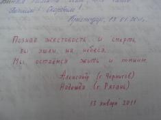 Йдучи по асфальтовій дорозі від кладовища до міста, я вкотре згадав напис на в’їздній стелі сумнозвісного карельського урочища Сандармох – "Люди, не вбивайте один одного". Жодна мета у цьому світі нічого не варта, якщо досягається ціною навіть одного людського життя. Тим більше - дитячого життя…