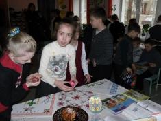 Учні дізналися про символи та кольори, якими розписують писанки та їх значення, передивилися відеофільм «Розмалюю писанку». Оознайомилися з книжками про свято.