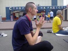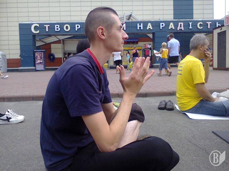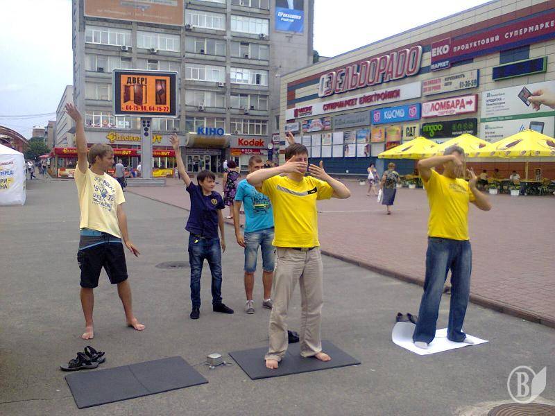 Під час медитації ми підглядали за здивованими перехожими. Вони показували пальцями, посміхалися. Деякі хотіли сфотографувати,соромилися, але все ж тягнули камери і фотографували незвичне явище.