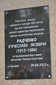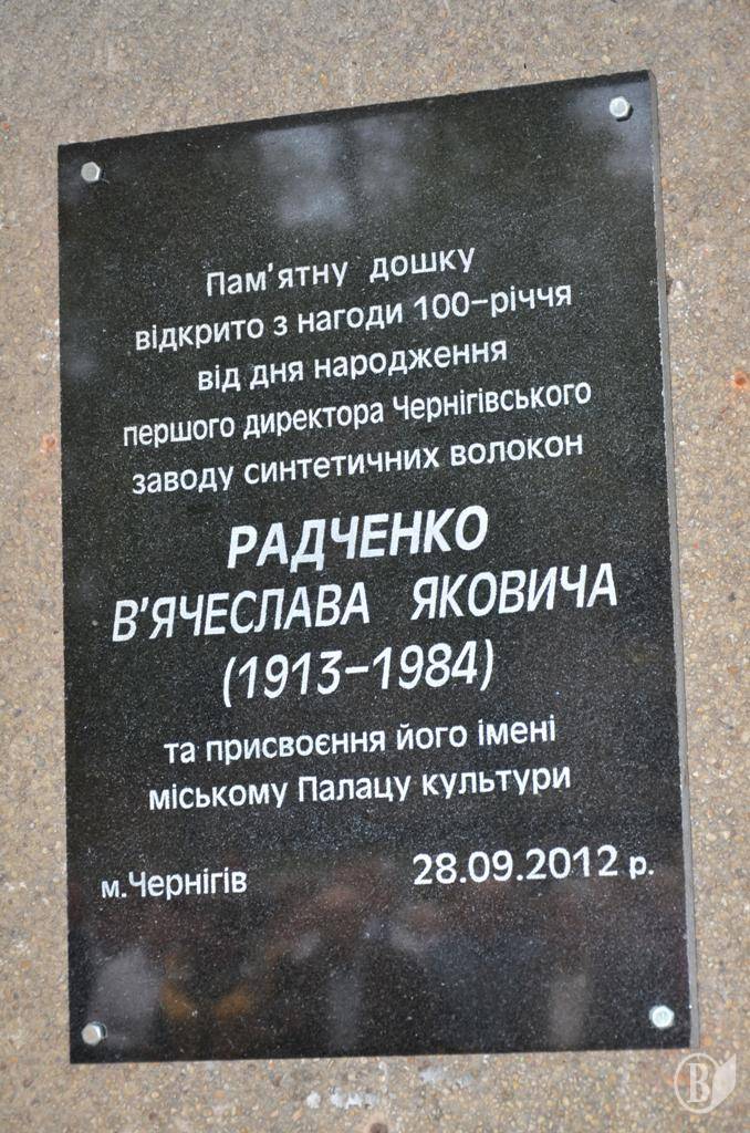 В’ячеслав Якович Радченко – перший директор заводу синтетичного волокна (нині ПАТ «Чернігівське Хімволокно»). Він зробив значний внесок у розвиток вітчизняної хімічної промисловості, за що був удостоєний звання лауреата Державної премії. Кадри, виховані В. Радченком, допомагали в налагодженні виробництва хімічних волокон у Болгарії, Польщі, Румунії, Росії, Латвії, Грузії та Узбекистані. Саме за його керівництва паралельно з будівництвом і успішним розвитком заводу в Чернігові збудовано житлові квартали, дитячі садки, Палац культури «Хімік», перша черга обласної лікарні, потужні споруди ТЕЦ. Його глибокий розум, масштабне мислення, організаторський хист і мудре управління залишатимуться яскравим зразком справжнього керівника.