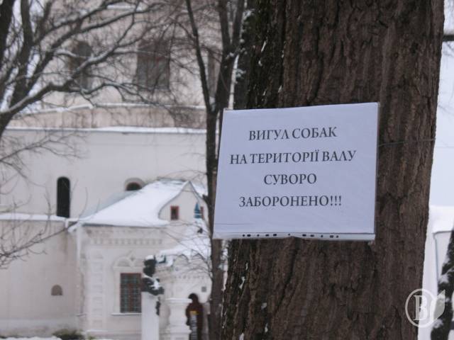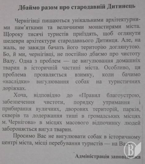 Таким чином, вигулювати собак в історичному центрі міста, місці перебування туристів — на Валу заборонено. Адміністрація та працівники Національного архітектурно-історичного заповідника «Чернігів стародавній» 14 грудня 2012 року розпочали відповідну роз’яснювальну акцію із власниками тварин.
