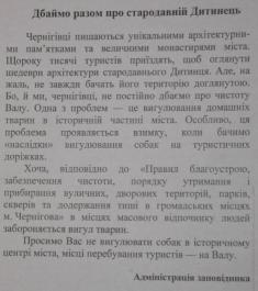 Ще одна з проблем — це вигул домашніх тварин в історичній частині міста. Особливо, вона проявляється взимку, коли бачимо «наслідки» вигулювання собак на туристичних доріжках.