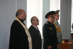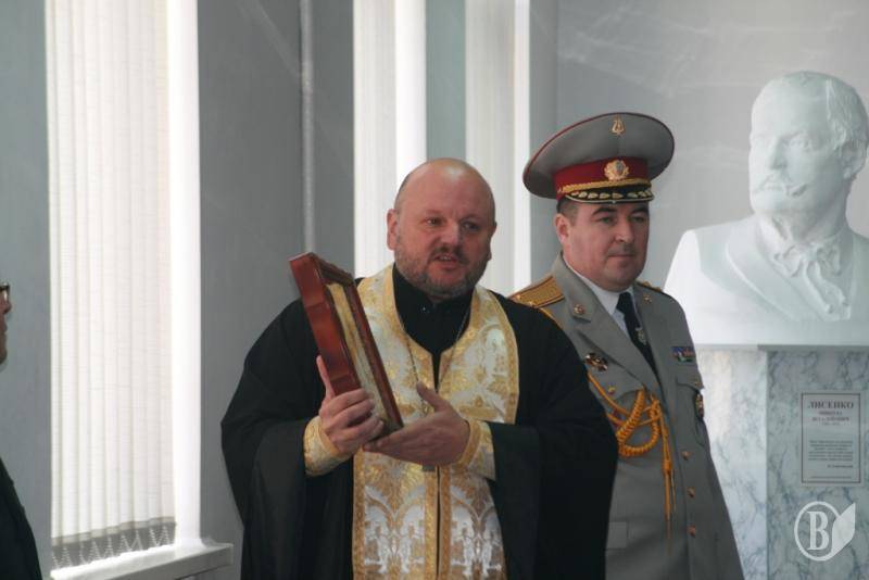 Також з вітальним словом до військових музик звернувся священик Храму всіх святих протоієрей Володимир, який, до речі, строкову службу свого часу проходив у військовому оркестрі залізничного полку в Чернігові. Протоієрей Володимир помолився за музикантів, благословив на бездоганне виконання ратної служби, підтримання високого бойового духу військовослужбовців і побажав їм міцного здоров’я, сімейного благополуччя і божої ласки. Священик подарував кожному з музикантів іконки з молитвами, військовому колективу – ікону святого Іоанна, а Валентину Мязю – Миколи Чудотворця.