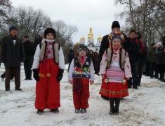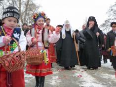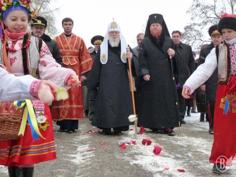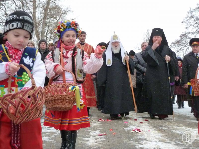 Дівчата в українських костюмах традиційно вкрили дорогу перед Патріархом пелюстками троянд:
