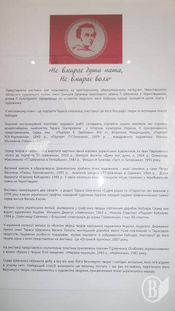 Представлена виставка дає можливість на оригінальному образотворчому матеріалі Чернігівського обласного художнього музею імені Григорія Ґалаґана простежити зв'язки Тараса Шевченка з Чернігівщиною.