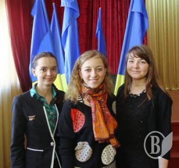 На одному зі знімків голова оргкомітету Анатолій Заліський та переможниця Марія Новик та кращі серед кращих, переможці Всеукраїнської олімпіади які отримали Дипломи 1-го ступеня