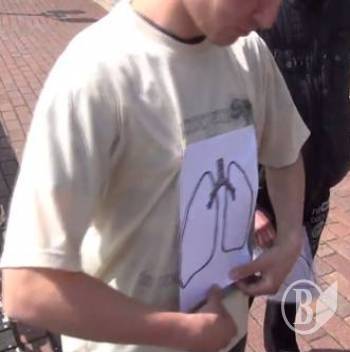 У рамках акції учасникам прикріпили на груди зображення чистих легенів, а згодом «шкідлива звичка» (в даному випадку хлопець з цигаркою) розмальовувала ці легені чорним кольором.