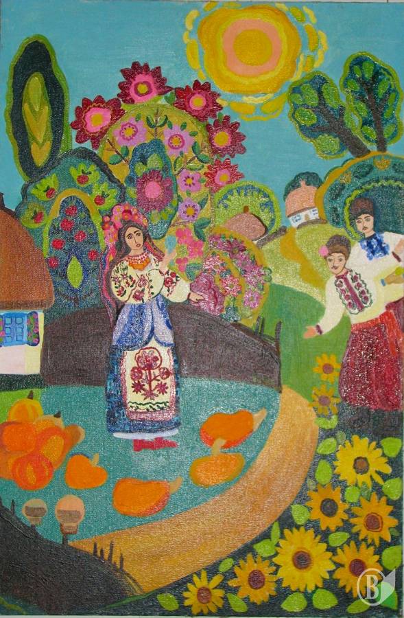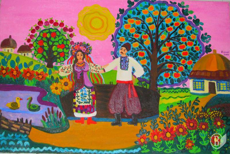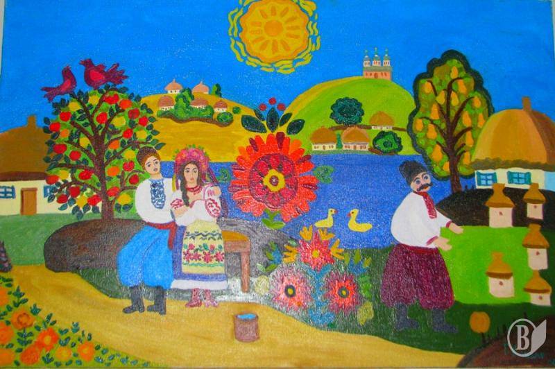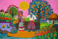 Представлені на виставці картини писані олійними фарбами на полотні. Майстриня перейняла славні традиції народних майстрів-малярів, ось чому всі картини пронизані національною тематикою та мають простий і зрозумілий сюжет, плавність ліній і яскраві кольори, сповнені чарівним буянням фарб, мотивами кохання та природи. Дивлячись на картини, ніби потрапляєш в казку, в якій біля української хати буяє вишневий садок, чудернацькі квіти виглядають з-за тину, чути лелеку, а на тлі буйної природи з’являються двоє закоханих: дівчина та юнак.