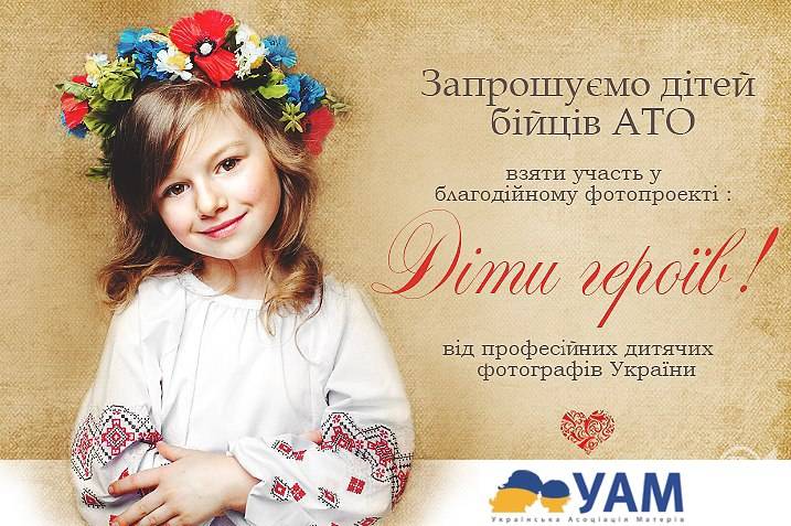 Громадська організація “Українська Асоціація матерів” запрошує родини, в яких батько є учасником АТО або, на жаль, загинув, захищаючи Україну, взяти участь у масштабному благодійному фотопроекті “Діти Героїв”.