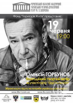 19 июня в Черниговском музыкально-драматическом театре имени Т.Г. Шевченко состоится благотворительный творческий вечер Алексея Горбунова и группы «Грусть Пилота». В программе знаменитые песни Акуджавы, Высоцкого, Цоя и других известных исполнителей.