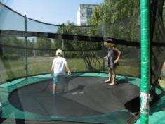 Дідусь Анатолій Петрович на батут привів відразу двох онучат - Олесю і Владика. Спадкоємцями дідусь дуже пишається:
