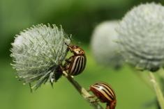 І тут мою увагу привернули пахучі квітки лопуха зі хмелями. Аж гульк, рядом сидить колорад. І що ви думаєте він робить, він їсть стебло лопуха.