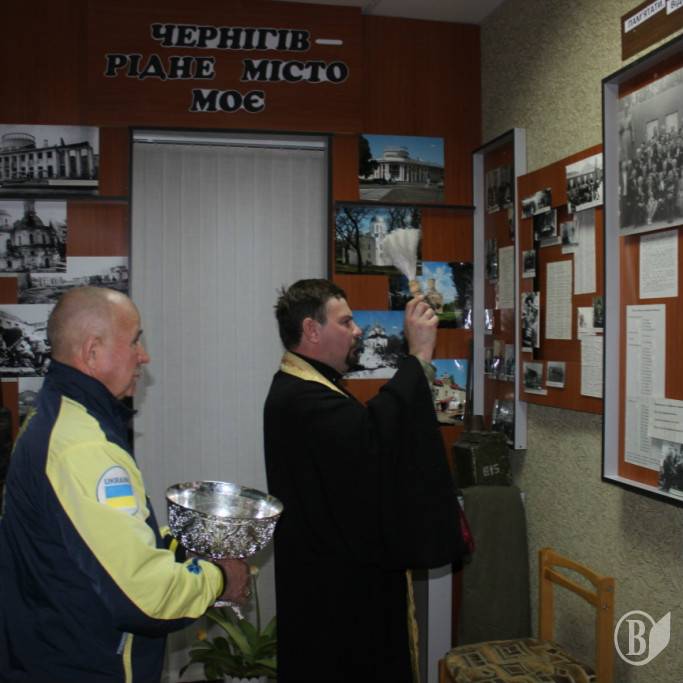 Отець Євген Орда, який неодноразово як капелан працював у підрозділах, задіяних в АТО, освятив приміщення музею, а голова Товариства сприяння обороноздатності України в Чернігівській області Ігор Мизган, який понад рік служив у зоні АТО заступником командира 13 батальйону з озброєння, розповів про своїх товаришів по зброї, історію створення батальйону та його бойовий шлях.