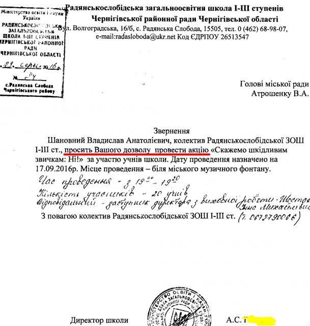 17 вересня колектив Радянськослобідської школи планує провести акцію для дітей у центрі Чернігова. Проти шкідливих звичок.