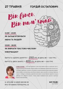 Цього разу на слухачів чекає аж два трьохгодинні майстер-класи! І хоча це буде дві різні теми, ми об'єднали їх одним спільним меседжем — "Вік вчись. Вік пам'ятай"
