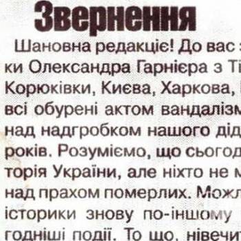 Нащадки чекіста Гарнієра прагнуть влаштувати перепоховання предка з Корюківки до рідного села Сядрине.