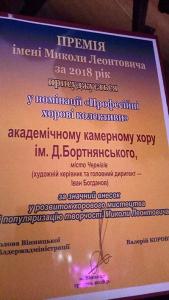 Академічний камерний хор ім. Дмитра Бортнянського (художній керівник і диригент Іван Богданов) здобув Всеукраїнську премію імені Миколи Леонтовича, яку вручають за визначні заслуги в розвитку музичного і хорового мистецтва.
