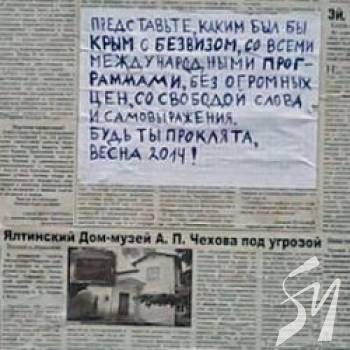 В центрі селища Саки розміщено, як в радянські часи, стенд з газетою. І ось 30 січня на сторінці газети з’явилася рукописна, «друкованими» літерами російської мови, листівка.
