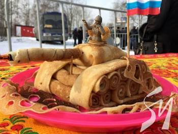 Несподівана кулінарна інсталяція, представлена в столиці «російського Чорнобиля» - Брянському місті Новозибков, може стати головним скандалом минулої Масниці. У центрі композиції, яка вважається як суто патріотична і повністю виготовлена з справжнісіньких млинців, великий «танк» з «ввічливим чоловічком» на вежі. Він прорвав «ворожу» оборону і встановив посеред чужих окопів, теж млинцевих, іграшковий російський триколор.