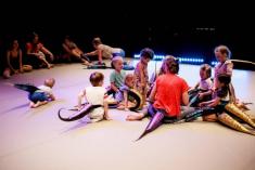Таємниче дійство. Маленькі глядачі знову сиділи по боках великого килима на м’яких матах. Тьмяне світло спочатку. Промінь прожектора. Здавалося ми перемістилися у часі на мільйони років у минуле, аби побачити, як зароджувалося життя на планеті Земля. Якісь істоти з хвостами виходили з моря на берег. Починалося зовсім інше життя.