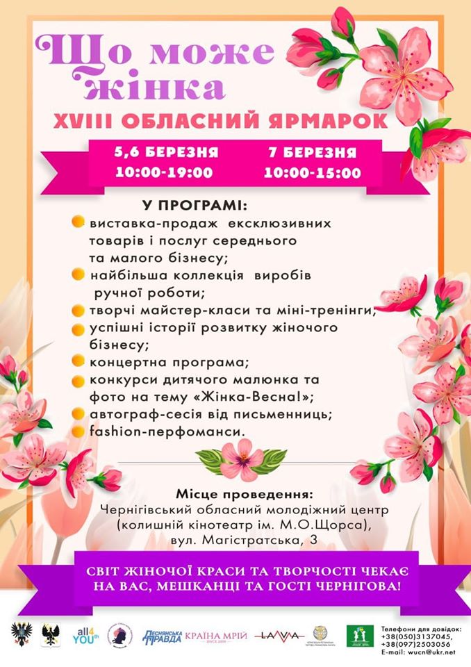 5-7 березня у КУ "Чернігівський обласний молодіжний центр" Чернігівської обласної ради (колишній кінотеатр ім. Щорса) м. Чернігів вул. Магістратська, 3 відбудеться XVIII щорічний обласний ярмарок "Що може жінка!".