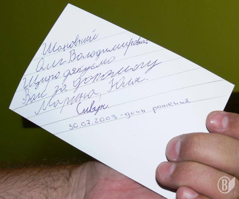 – Для двух девочек – Юли и Марины, папа которых стоит у нас на рынке, мы приобрели слуховые аппараты и хотим оправить летом на оздоровление, поскольку им путевки достаются всегда зимой (показывает открытку, которую девочки очень искренне подписали Олегу на день его рождения – ред.)…
