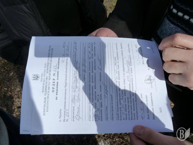 Ордер про видалення зелених насаджень був виданий ще 21-го жовтня минулого року Дільницею контролю за благоустроєм Чернігівської міськради. Виконавцем робіт виступило підприємство «Райагробуд».