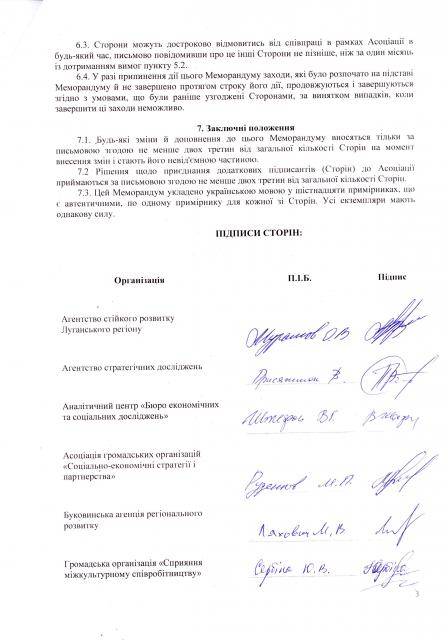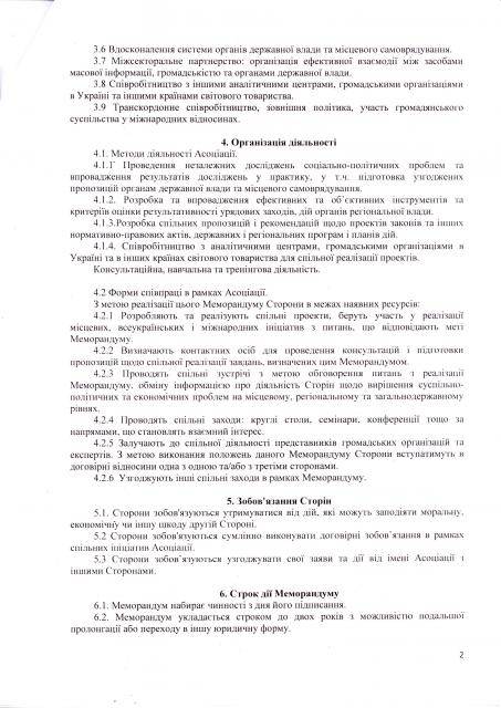 - підписання Меморандуму про взаємодію та співробітництво регіональних аналітичних громадських організацій України у складі Асоціації регіональних аналітичних центрів;