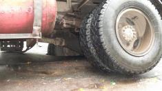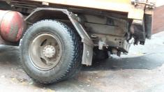 В Чернігові сміттєвоз провалився заднім (здвоєним) колесом на днями заасфальтованій ділянці проїзду.