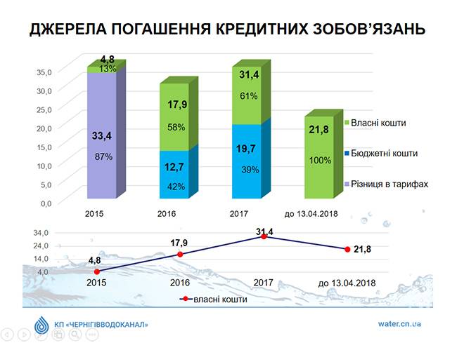 Згідно з графіком погашення кредитних зобов’язань, до 15 квітня 2018 року комунальне підприємство «Чернігівводоканал» Чернігівської міської ради мало сплатити $422125,36 та $266667. Вся сума була погашена повністю.