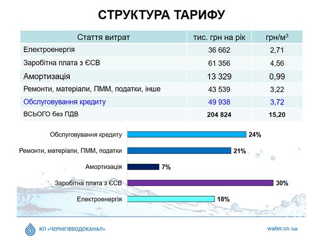В структурі діючих тарифів витрати на обслуговування та повернення кредитів (фінансові витрати та прибуток) складають 24%.