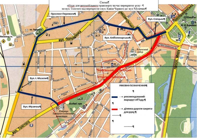 Рекомендований об’їзд даної ділянки вулично-дорожньої мережі міста здійснюватиметься вулицями Єлецькою, Князя Чорного, Хлібопекарською, проспектом Перемоги та вул. І. Мазепи.