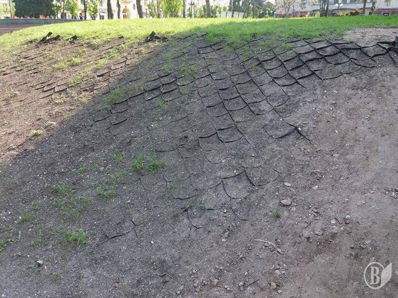 У сквері Хмельницького в Чернігові після торішньої реконструкції, яка начебто завершена, чернігівці дивуються рішенню щодо укріплення схилів такою собі «гумовою стрічкою», викладеною на ребро хрест-навхрест.