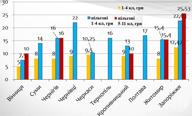 Залучення коштів з бюджету на компенсацію частини вартості харчування деяких категорій учнів є не у всіх містах. Для прикладу, в Луцьку, Івано-Франківську, Ужгороді, Рівному, Полтаві та Тернополі такої практики немає. Щодо інших міст - інформація у діаграмі нижче.