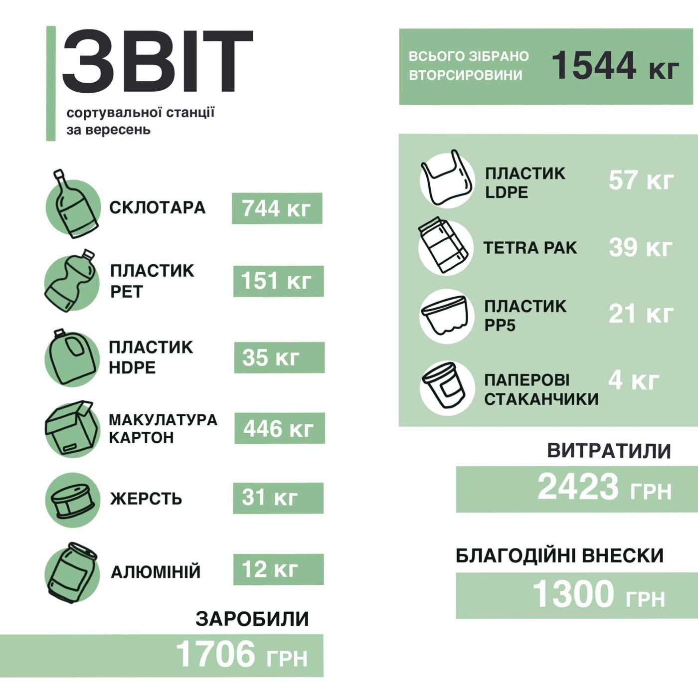 Екоактивісти відзначають, що на обслуговування станції у вересні вони витратили 2423 грн. Зокрема, 1 700 грн – на оплату високотемпературного спалювання, 400 грн пішло на логістику, решта – на відправку Tetra Pak та паперових стаканчиків в Київ. Окрім 1 706 грн за реалізацію упаковки, цього місяця станція отримала 1 300 грн – благодійних внесків. Фінансово підтримати роботу освітньої станції сортування можна благодійним внеском за наступним посиланням - Підтримати. За кожну гривню, яка надійде, сортувальна станція обіцяє обов'язково відзвітуватись.
