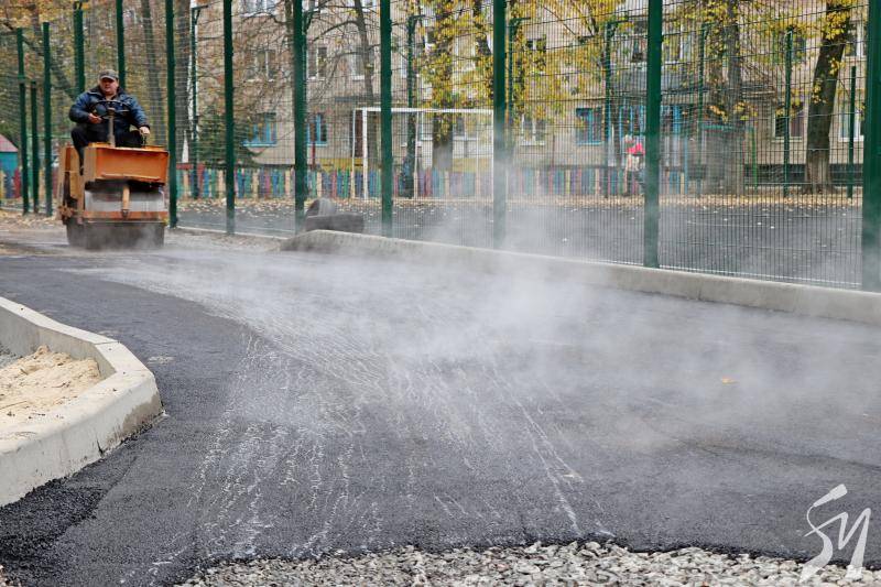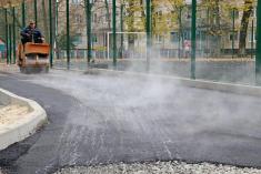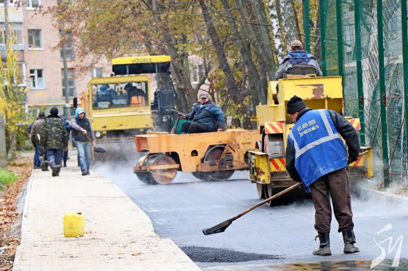 Там уже прокладені цегляні тротуари. Зараз дорога покривається гарячим асфальтобетоном.