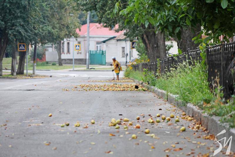 Чернігів зранку, у понеділок, 28 липня, очікував на грозу. О 5:32 металевий жіночий голос повідомив про відбій повітряної тривоги. А жовті метелики з мітлами уже давно мели вулиці. Особливо Князя Чорного, де щодня птахам по коліно груш.