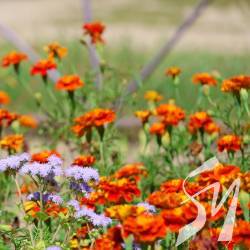 Поле чорнобривців біля врятованого будинку