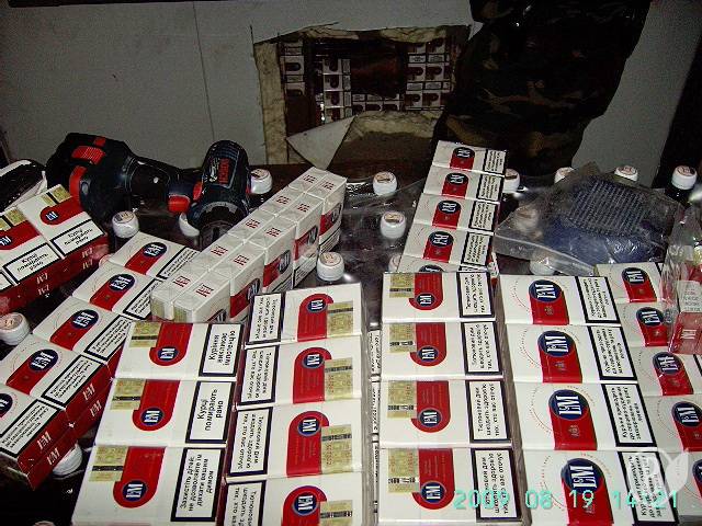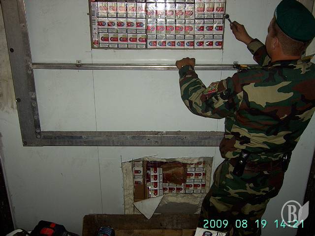 После частичного демонтажа фальшивой стенки был обнаружен тайник где, по предыдущим подсчетам, находилось больше 10000 пачек папирос LM украинского производства.