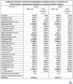 Загалом, у 2011 році три регіони – м. Київ, Донецька та Луганська області - одержали 56% від усього обсягу 31,2 млрд гривень субсидій та трансфертів.