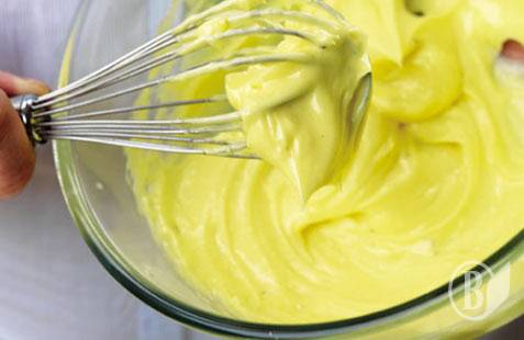 Потім акуратно, по крапельці ввести у суміш жовтків рослинну олію, одночасно збиваючи міксером (на низькій швидкості), слідкувати за тим, аби олія з’єдналась із жовтками в однорідну емульсію.