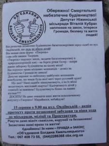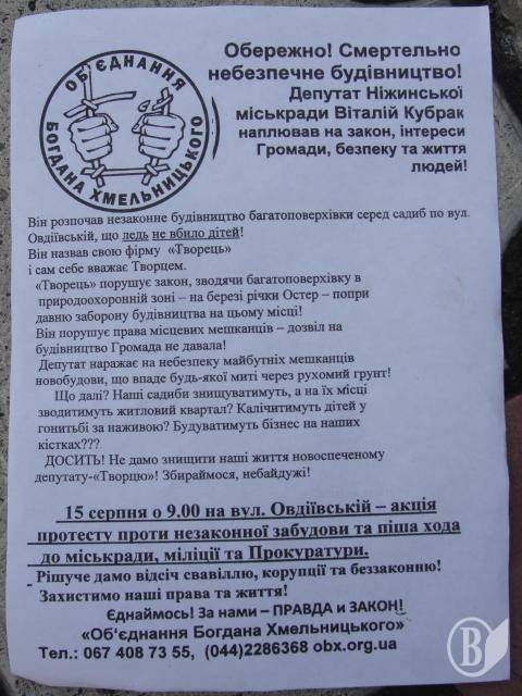 Організатори мітингу з Всеукраїнської громадської організації «Об’єднання Богдана Хмельницького» під час пікету заявляли, що не зважаючи на те, що будівництво в природоохоронній зоні заборонено, місцева влада видає дозволи на зведення багатоповерхівок. Зокрема, депутат Ніжинської міськради Віталій Кубрак отримав усі документи і зводить комерційне житло (семиповерховий тридцятиквартирний будинок) на відстані 65 метрів від лінії берега, навіть не спитавши думку Громади.
